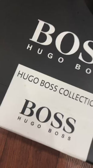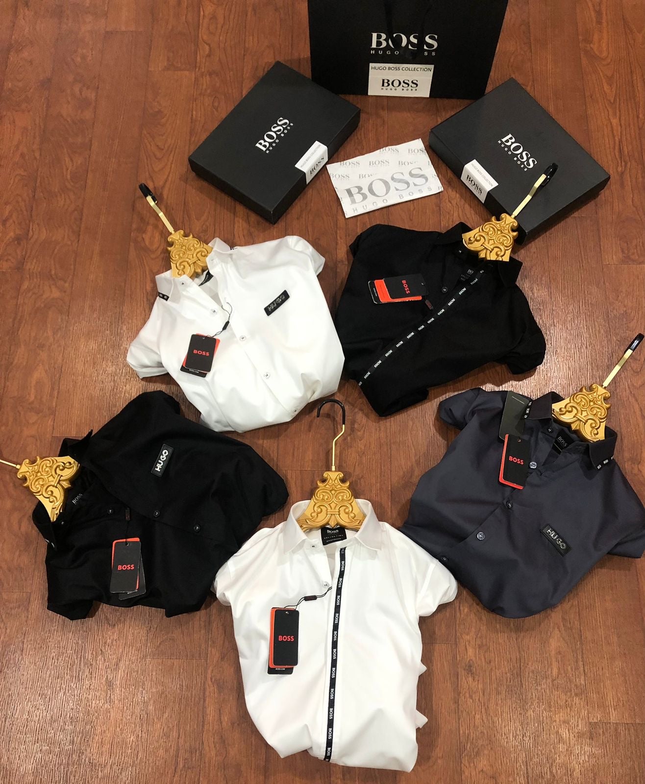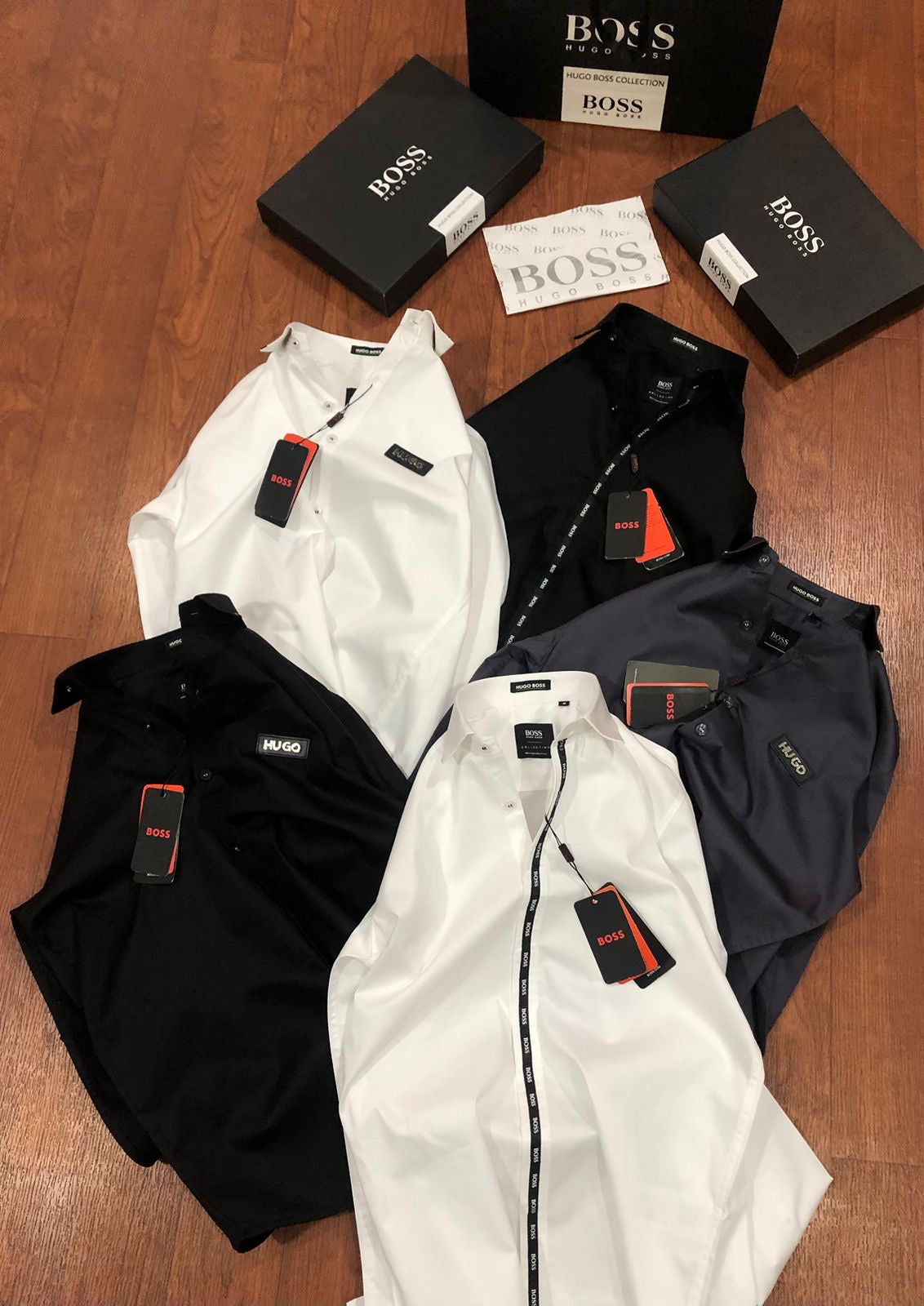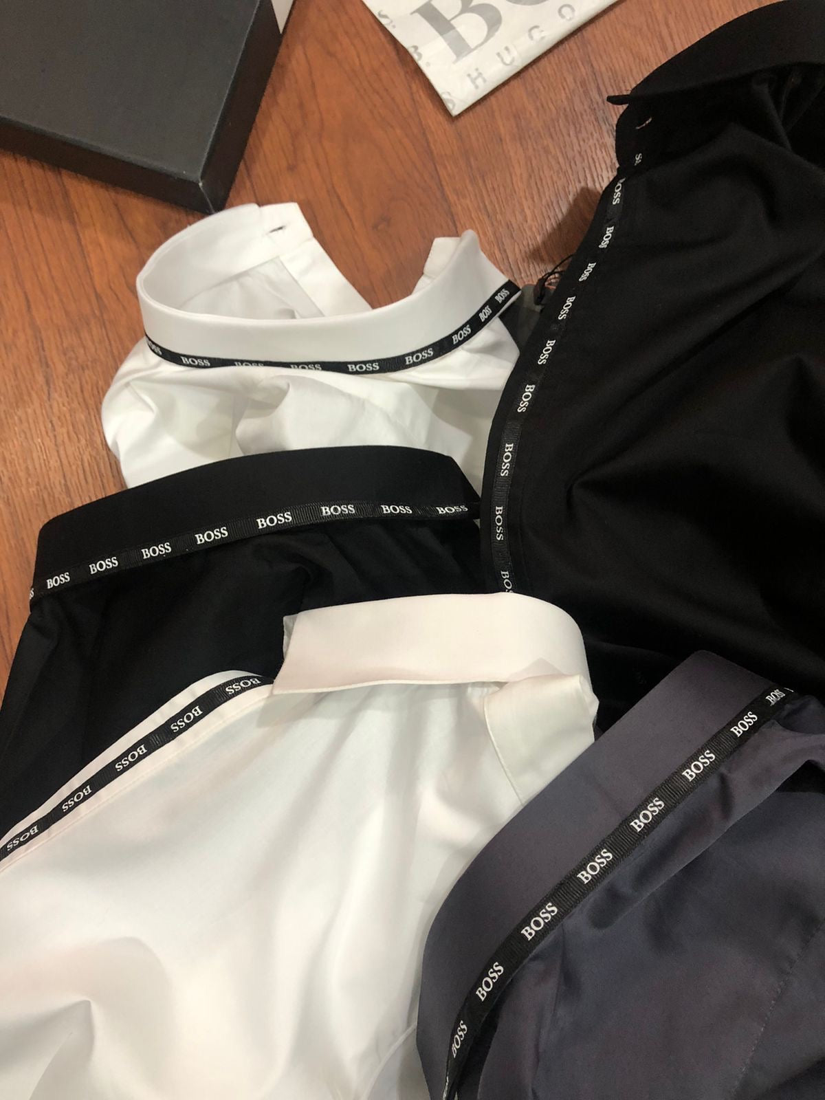 BOSS SHIRT BLACK COLOUR COLLAR STRIP WITH METAL STEEL LOGO AND LEATHER PATCH